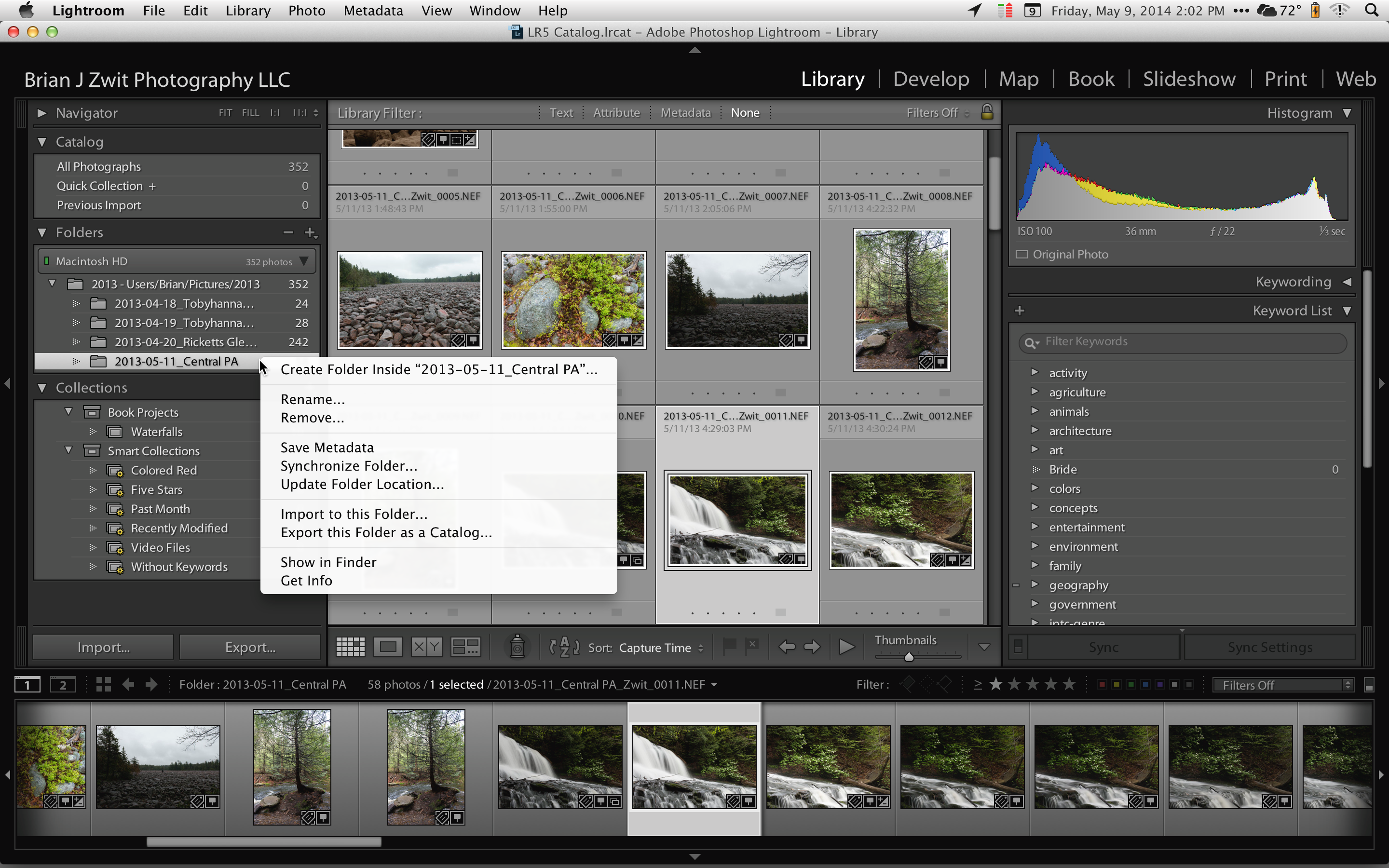 Context menus are great for speeding up your workflow. Right-click on an image and you are presented with a list of pertinent commands that can be performed on the image. To invoke an action in the context menu, simply click on it. For example, right-click a folder name inside the Folders panel and you can create a folder inside the folder, rename the folder, remove the folder, save metadata, synchronize a folder, update a folder location, Import to the folder, export the folder as a catalog, show in finder, or get help. See image 2. This much simpler than searching eight menus for the right commend.