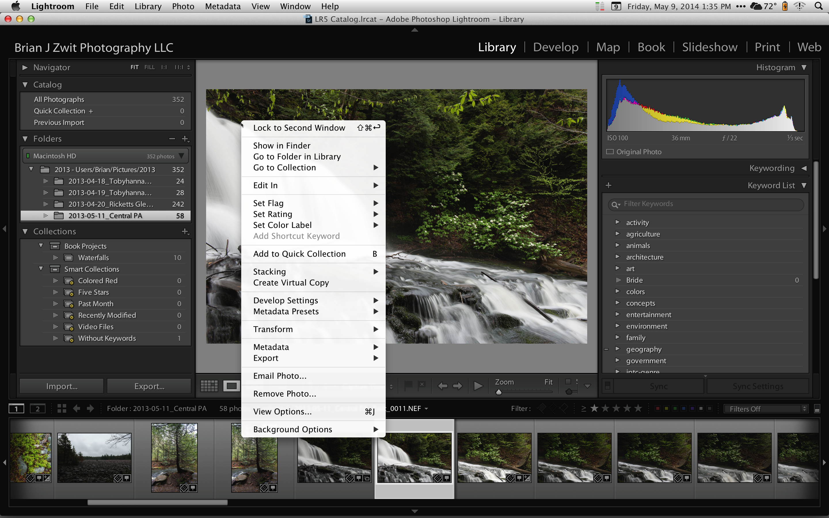 The second tip in this series on improving your Lightroom workflow is simple: Use context menus. A context menu aka contextual, shortcut, or pop-up menu is a menu in Lightroom that is displayed by right-clicking on an object in the user interface. See image 1. You can click on almost any object, including an image, a folder or collection name, and a keyword. The context menu will allow you to perform a limited set of actions related to the object or the current state of the application. Context menus are available in most programs, not just Lightroom